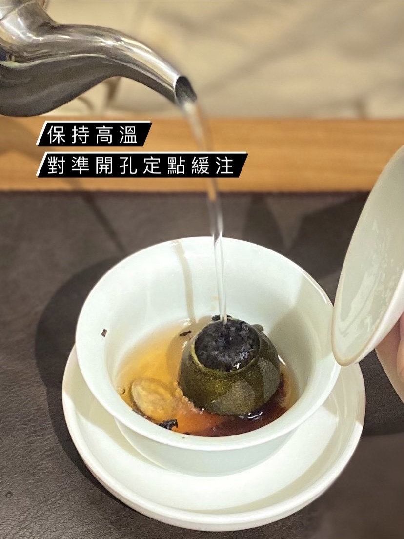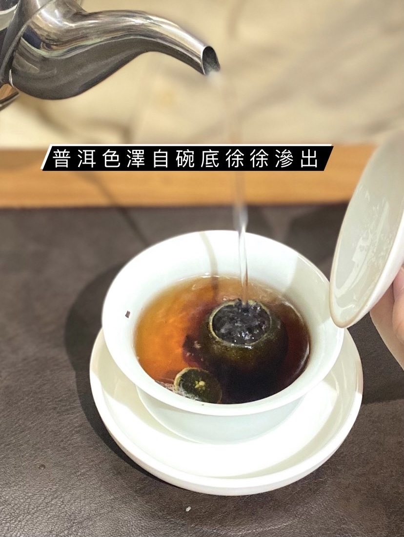 香氣:柑果香濃郁,熟普香醇無雜味,柑、茶之香味相互融合得宜