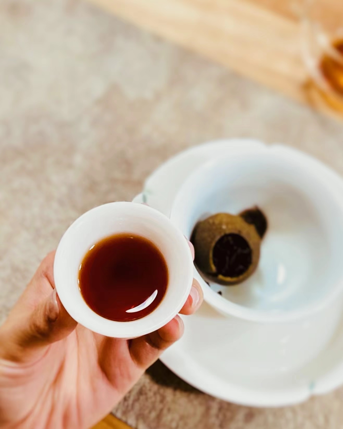 外型:小巧玲瓏,柑皮的油包飽滿密集,內裡的宮廷熟普紅褐勻淨顯金芽