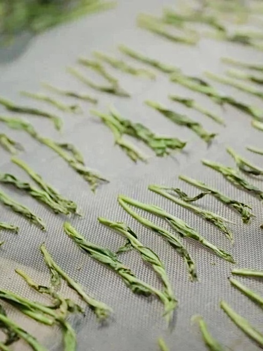 捏尖塑型後,平鋪於鐵絲網上,再碾壓滾平,形成扁平細長、並帶有網狀紋路的條形茶,最後經炭火烘乾製成,因此在工藝上屬於烘青綠茶。